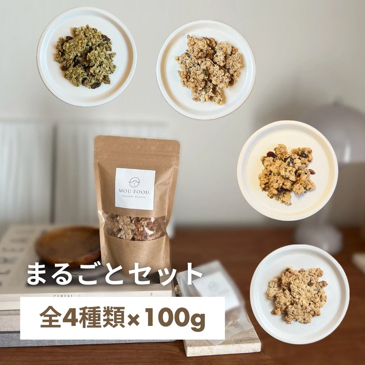 MOU FOOD. のまるごとセットは、100gずつの全4種類を詰め合わせた贅沢なセットとなっています。贅沢な素材を使用し、ひとつひとつ丁寧にブレンドされた風味豊かな品々が、毎日の食事やおやつタイムに彩りを添えてくれます。お好きな種類を自由に楽しみながら、豊かな味わいを堪能してください。