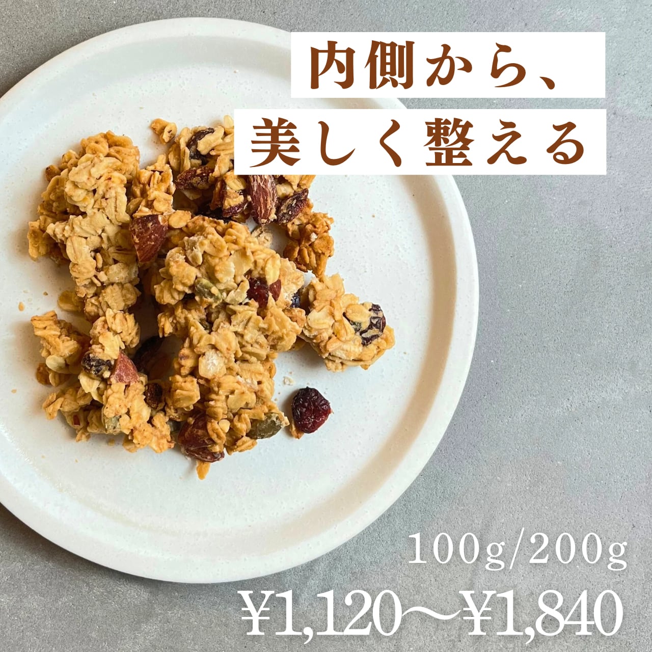 レーズン、クランベリー、くこの実と、アーモンドやカシューナッツを組み合わせた「華やかなビューティーグラノーラ」。